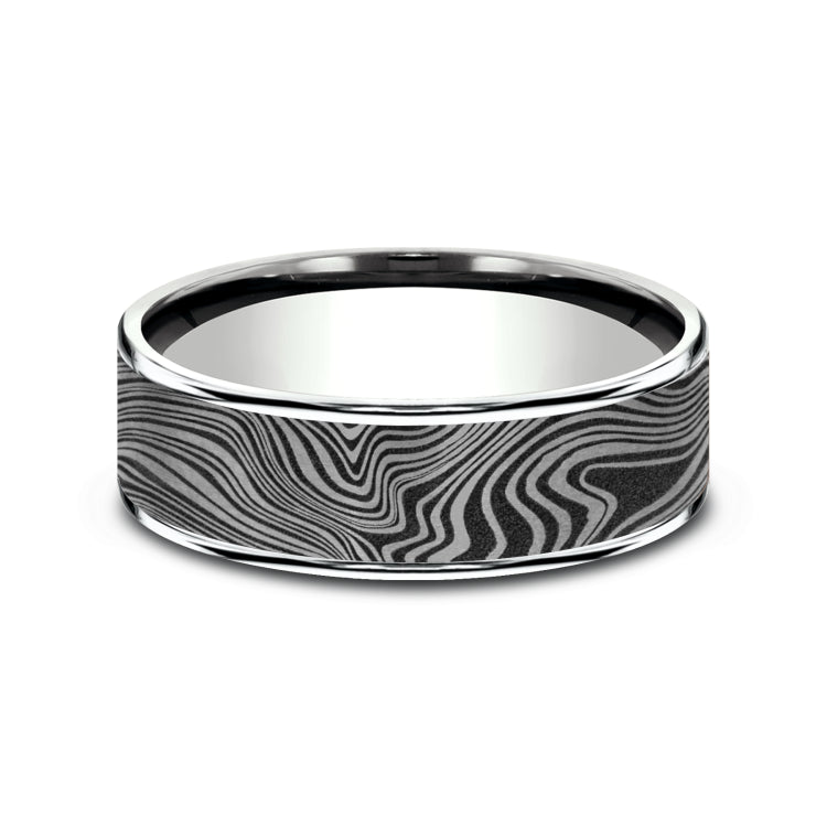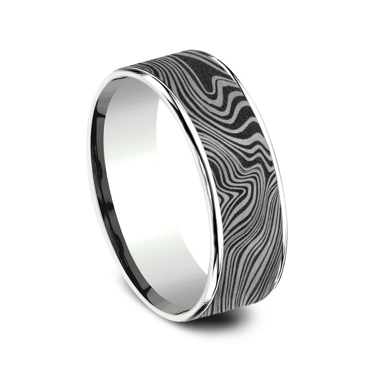 7.5mm, Comfort fit14K White Gold and Grey TantalumUnique Tamascus designed center, thin edges