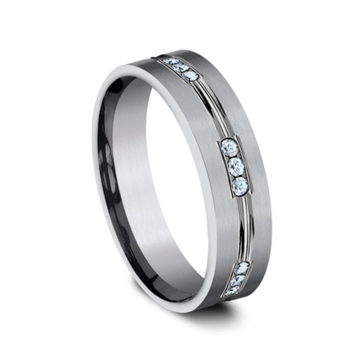 6mm, Comfort fitGrey TantalumSatin finish, polished center cut18 channel set lab grown diamondsCarat weight is .36ctClarity SI1-2, Color GH