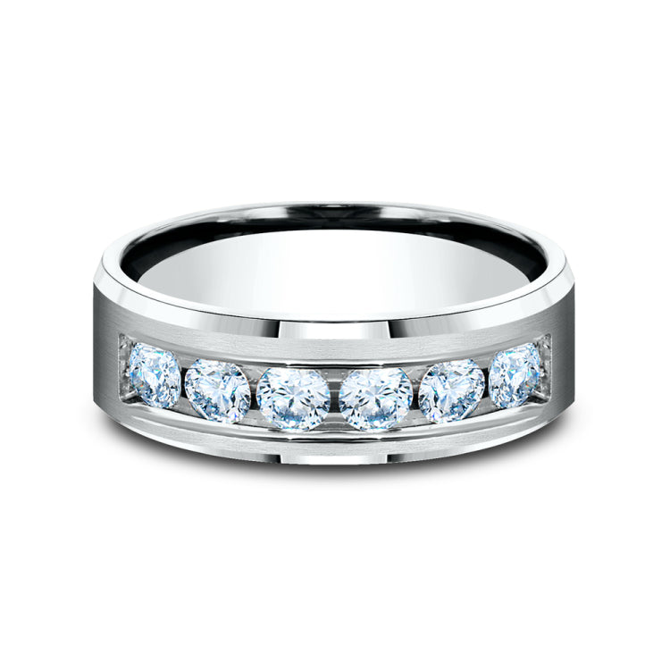 7mm, Comfort fit14K White GoldSatin center, bevel edges6 channel set diamondsCarat weight is .96ctClarity SI1-2, Color GH