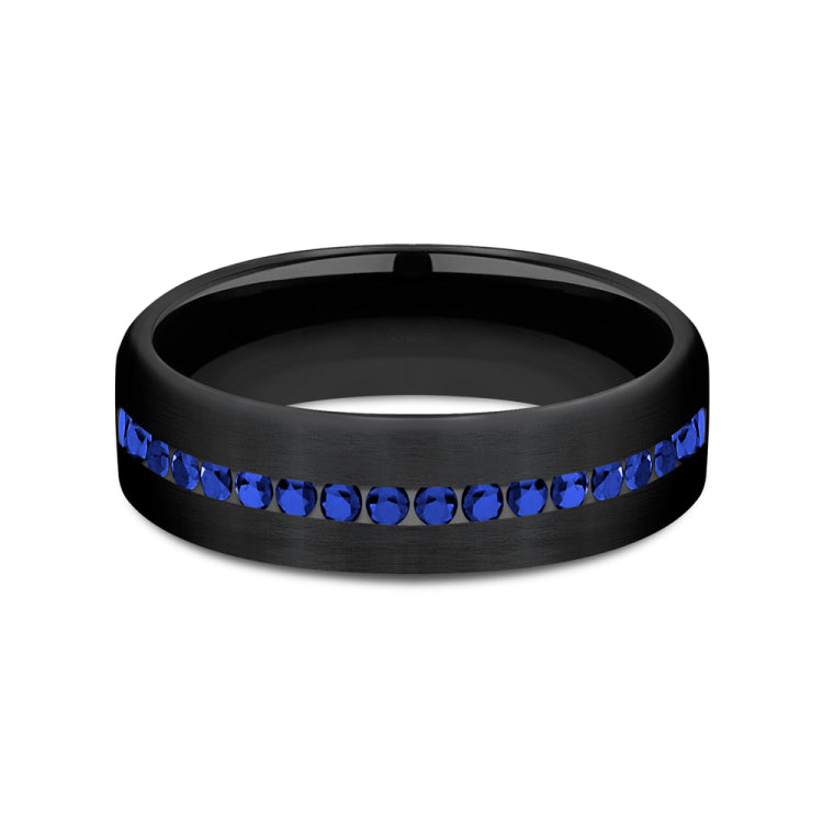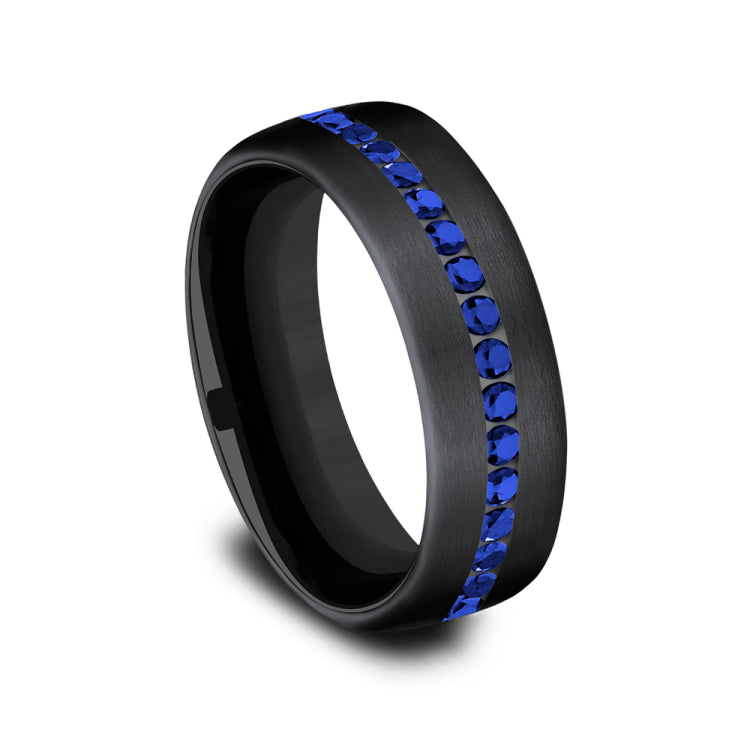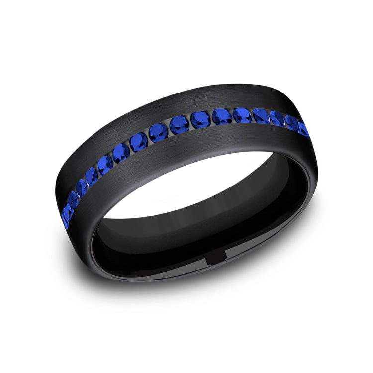 6.5mm, Comfort fitBlack TitaniumSatin finish20 channel set blue sapphiresCarat weight is .40ct