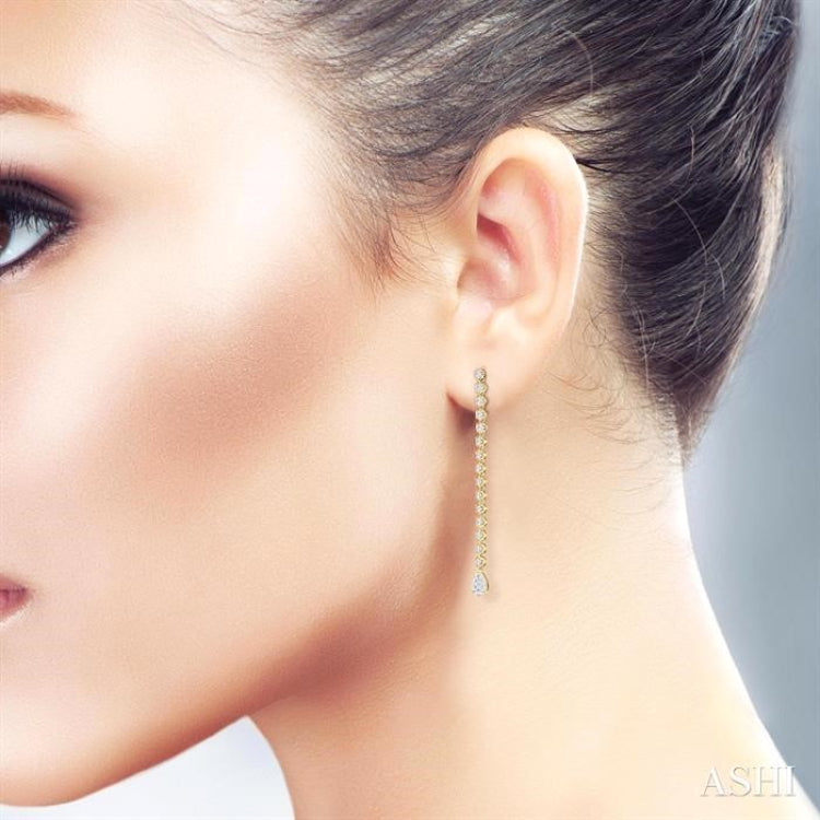 perfect for any special occasion or to add some sparkle to your evening wear, these Lovebright diamond fashion long earrings are a must-have addition to your jewelry collection. Indulge in its luxurious design and let your style shine bright. The stunning earrings feature a dazzling vertical row of 15 prong set round cut diamonds on each earring total 30 diamonds, creating a mesmerizing cascade of sparkle. The glamour does not stop here, as at the tip of each earring, a beautiful pear-shaped mount is visible, adorned with an additional 10 each invisible set round cut diamonds total 20, adding an extra touch of brilliance. Push-back earnut closures comfortably secure these beauties. The Lovebright fashion long earrings are styled in a polished rhodium finish 14 karat yellow and white gold. Total diamond weight is 1 1/4 Ctw.
