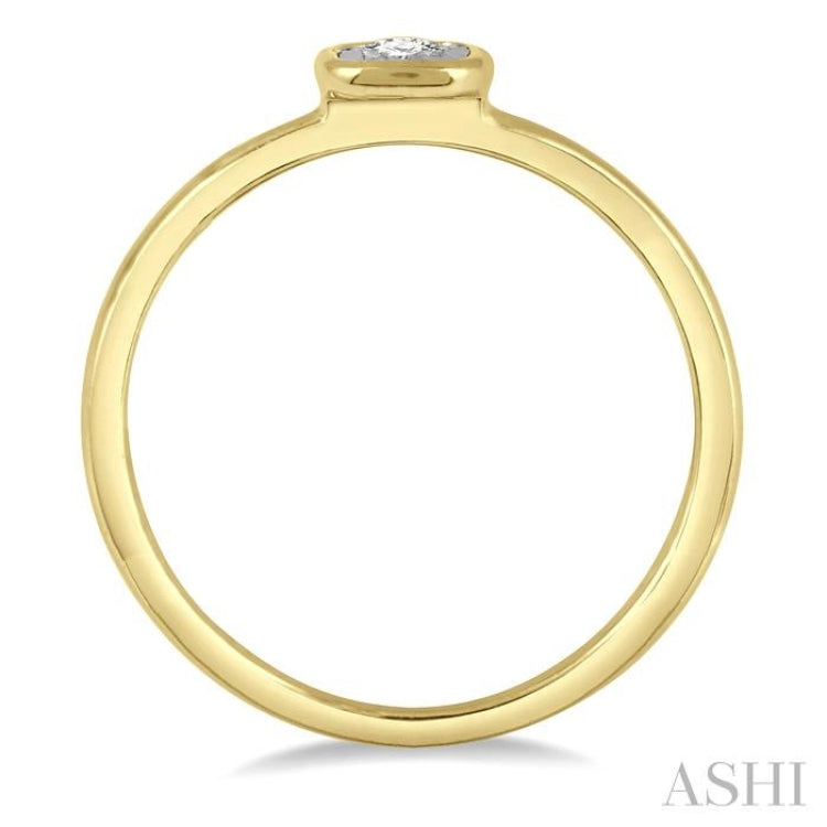 Elegance in simplicity is the focal describing feature of this dainty lattice diamond ring. Nestled attractively in a 3D square curved edge metal plate, the prong set round cut diamond offers appeal and radiance to the 10 karat yellow gold ring. A plain bezel compliments the shank, making the center stone the focus of attention. The beautiful diamond ring offers a non-fussy, chic look and is perfect for the smart, professional woman of today. The total diamond weight is 1/50 Ctw.