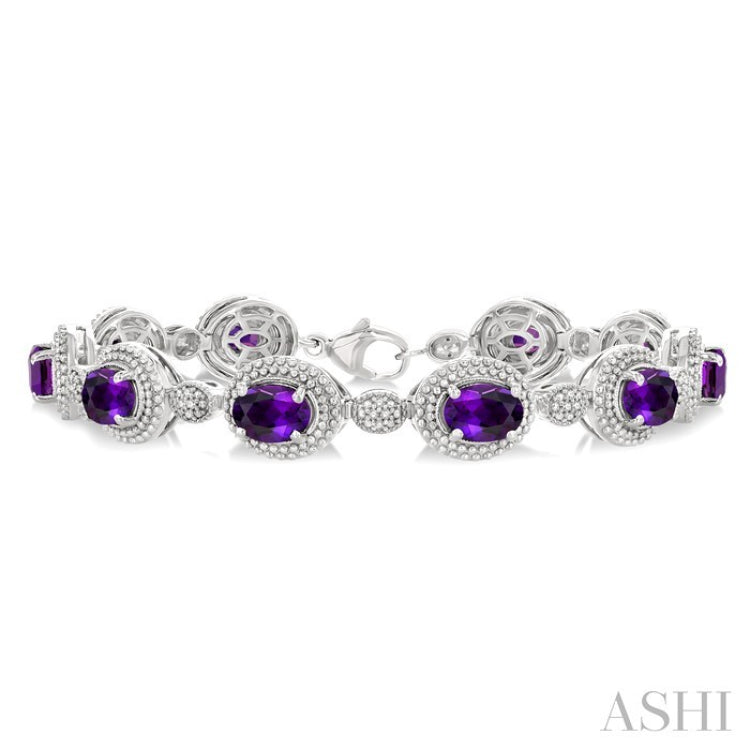 Infuse your ensemble with a burst of color and texture, with this semi-precious bracelet. From daytime sophistication to evening refinement, it stands as a testament to thoughtful design and enduring style. Along its length, 10 large oval-shaped mounts showcase richly faceted 7X5 MM oval cut amethysts, each framed by a subtly textured border that accentuates the gemstone's violet glow. Between these larger settings, 10 smaller oval mounts collectively carry 32 pave set round cut diamonds, their fine sparkle providing a luminous counterpoint. Each link pivots smoothly into the next, creating a fluid yet structured silhouette that glides around the wrist, secured by a lobster clasp. The semi-precious bracelet is styled in rhodium finish silver. Total diamond weight is 1/10 Ctw.