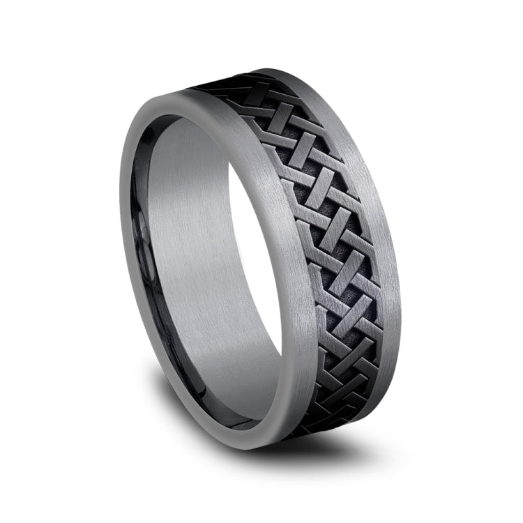 8mm, Comfort fitGrey Tantalum and Black TitaniumCeltic knot patterned center, straight edges